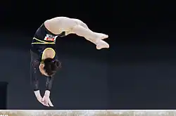 Claudia Fragapane (born 24 October 1997)[3] is a retired British artistic gymnast.[4][5] She came to prominence at the 2014 Commonwealth Games, where she was the first English woman to win four gold medals in a single Games since 1930.[6] In 2015, Fragapane was part of the women's gymnastics team that won Great Britain's first-ever team medal, a bronze, at the World Artistic Gymnastics Championships, before winning an individual world championship bronze on floor two years later.[7]