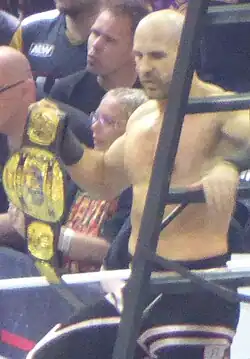 Castagnoli and Hero were scheduled to face PWG World Tag Team Champions, ¡Peligro Abejas! (El Generico and Paul London), in a non–title match at the following event. Due to Castagnoli's title win, the Champions agreed to put their belts on the line as long as Castagnoli agreed to give the victor a shot at the PWG World Championship, should the Kings lose. After Castagnoli had agreed to the stipulation, ¡Peligro Abejas! defeated him and Hero to retain the World Tag Team Championship and earn El Generico a shot at the PWG World Championship.[84] On 29 January 2011, during the WrestleReunion 5 weekend, Castagnoli made his first successful defense by defeating El Generico.[85] On 4 March Castagnoli and Hero entered the 2011 DDT 4 Tournament, defeating the Cutler Brothers (Brandon and Dustin Cutler) in their first-round match. However, in the semifinals of the tournament the Kings of Wrestling suffered an upset loss against the Nightmare Violence Connection (Akira Tozawa and Kevin Steen) when Tozawa rolled Hero up for the win.[86] On 9 April Castagnoli defended the PWG World Championship against the Battle of Los Angeles winner, Joey Ryan, who had knocked him out of the previous year's tournament.[87] On 27 May, during the first night of All Star Weekend 8, Castagnoli successfully defended the PWG World Championship against his longtime tag team partner Chris Hero.[88] The following night, Castagnoli defeated Low Ki to retain the title.[89] On 23 July at PWG's eighth anniversary show, Castagnoli defeated Hero in a rematch for the PWG World Championship. After the match Castagnoli accepted a challenge from Kevin Steen and ended up losing the title to him in the impromptu match, ending his reign at 287 days.[90]