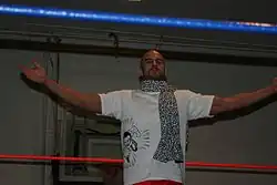 Castagnoli entered the 2009 King of Trios teaming with Bryan Danielson and Dave Taylor as Team Uppercut. The team advanced to the finals of the tournament, where they were defeated by F.I.S.T. (Icarus, Akuma and Taylor).[23][24][25] After the tournament Eddie Kingston, whose team The Roughnecks had been eliminated by Castagnoli and his team, claimed that he had been embarrassed and disrespected by Castagnoli.[5] On 24 May 2009, Kingston, who had claimed technical superiority over Castagnoli, pinned him cleanly with an Oklahoma roll.[26] After Castagnoli defeated Kingston via countout at the 2009 Young Lions Cup,[27] the two of them were booked in a "Respect Match" on 22 November 2009, at the season eight finale Three-Fisted Tales, where the loser of the match had to show respect to the winner. Castagnoli won the match, but instead of showing respect, Kingston attacked him, claiming that both Castagnoli and his former partner (Chris Hero) were shady and did not deserve respect.[28] At the conclusion of the show Ares revealed himself as the man who had been stalking UltraMantis Black, at which point Castagnoli turned rudo by attacking Mike Quackenbush. After beating the entire tecnico roster Castagnoli aligned himself with Ares, Tursas, Pinkie Sanchez, Tim Donst, Sara Del Rey, and Daizee Haze to form the Bruderschaft des Kreuzes.[28]
