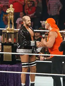 During the WrestleMania XXX pre-show on 6 April, The Real Americans were the final team eliminated during a fatal four-way tag team elimination match for the WWE Tag Team Championship.[138] Jack Swagger blamed Cesaro for the loss and put Cesaro in the Patriot Lock before Colter demanded that the duo to shake hands. Cesaro instead retaliated with a Cesaro Swing on Swagger.[139] Later during the pay-per-view Cesaro was a surprise entrant in the inaugural André the Giant Memorial Battle Royal, which he won by making the final elimination of the Big Show, body slamming him over the top rope and out of the ring in a manner reminiscent of Hulk Hogan's body slam of André at WrestleMania III.[140] In a 2015 interview, Cesaro would describe this victory as his "career highlight" to that point.[6]