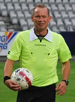 Claus Bo Larsen (born 28 October 1965 in Odense) is a former Danish football referee who officiates in the Danish Superliga and was FIFA-listed from 1996 to 2010. He has officiated numerous matches in the UEFA Europa League and Champions League. Larsen is classified as a FIFA Top Class Referee, which is the highest level of referees. He is well known for his down-to-earth appearance on the field, preferring to control the game with a good personality rather than cautioning the players.