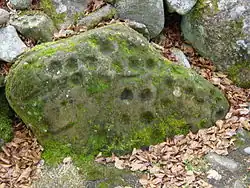 At Balnuaran of Clava itself there is a group of three Bronze Age cairns which lie close together in a line running north east to south west. The tombs at either end are of the passage grave sub-type. The central cairn is of the ring cairn sub-type, and uniquely has stone paths or causeways forming "rays" radiating out from the platform round the kerbs to three of the standing stones. The cairns incorporate cup and ring mark stones, carved before they were built into the structures. The kerb stones are graded in size and selected for colour, so that the stones are larger and redder to the south west, and smaller and whiter to the north east. All these elements seem to have been constructed as one operation and indicate a complex design rather than ad hoc additions.