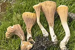 The species has a yellow-orange fruiting body in the shape of a club with a flat cap.[7] The flesh is white, thin, and hollow at the top.[8] The vertical side of the fruiting body normally has folds and wrinkles, but can be smooth. The spores are smooth and their spore print is pale yellow to ochre.[9]