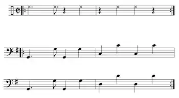 - ^ Garrett, Charles Hiroshi (2008). Struggling to Define a Nation: American Music and the Twentieth Century, p.54. ISBN 978-0-520-25486-2. Shown in common time and then in cut time with tied sixteenth & eighth note rather than rest.