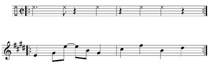 Like clave, the standard pattern is expressed in both triple and duple-pulse. The standard pattern has strokes on: 1, 1a, 2& 2a, 3&, 4, 4a.