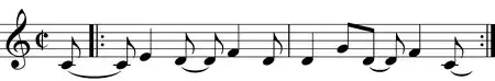 Going only slightly into the rhythmic structure of our music we find that all its melodic design is constructed on a rhythmic pattern of two measures, as though both were only one, the first is antecedent, strong, and the second is consequent, weak—Grenet (1939).[21]