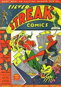 ![]() Cover of Silver Streak Comics #8 (March 1941), art by Jack Cole. | |