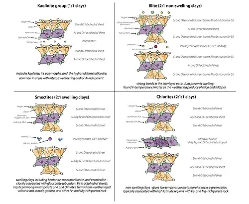 - Other 2:1 clay types exist such as palygorskite (also known as attapulgite) and sepiolite, clays with long water channels internal to their structure.
