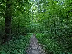 The park is primarily made of mature forest, of which 78-acre (32 ha) has been designated old-growth forest by the Old-Growth Forest Network.[1][9] The park's old growth forests are dominated by stately stands of beechs, red and white oaks and birchs, with shagbark hickorys and tulip poplars, and black oaks also being plentiful. The forest understory is considered one of the best in the county for wildflowers and contains a wide variety of perennial plants.[4][3] The park also contains fields and a small man-made fishing pond, which a habitat to beavers, egrets, herons and turtles.[10]