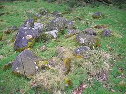 In some areas which are now unproductive moorland, aerial photographs show the presence of numerous prehistoric clearance cairns and associated dwellings such as hut-circles. This clear evidence of previous ancient habitation and cultivation shows that the climate worsened until the farmers were forced to move to lower ground.[10]