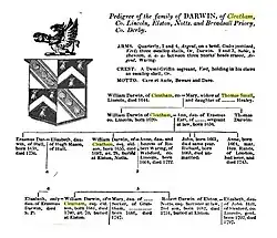 Charles Darwin mentioned in his writings that his ancestor William Darwin (1575-1644) owned the estate at Cleatham in about 1600. He described him as someone who "considered himself a gentleman, bore arms and married a lady. He was also yeoman of the armoury of Greenwich to James 1 and Charles I."[4] It passed through successive generations of the Darwin family as shown in the pedigree chart. Charles Darwin describes these ancestors in the following terms.