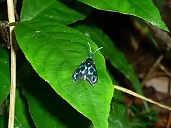 Adults have bright blue markings on the forewings. It is a day-flying species,[1] with a wingspan under 50mm.