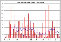 In all Tests, Hill scored 3,412 runs at an average just under 40 runs per innings and including seven centuries.[67] When he retired he had scored more runs in Test cricket than any other player; a record he held for 12 years until surpassed by Jack Hobbs.[68] In 1902 Hill was the first to score 1,000 Test runs in a calendar year; the next to do so was Denis Compton 45 years later in 1947.[34] Prolific in Australian state cricket as well, he headed the South Australian first-class averages on ten occasions between 1895–96 and 1910–11. In successive innings in 1909–10 he scored 175 against Victoria in Adelaide, 205 against New South Wales and 185 against Victoria in Melbourne.[3] He was the only Australian to score more than 17,000 runs in the period before pitches were protected from rain.[5] In club cricket he averaged more than 100 runs for the season on three occasions.[3]