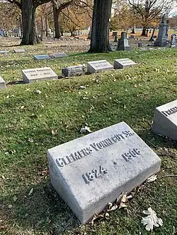 He married Katarina Blank in 1852 and moved to a modest house on West Market Street, Indianapolis. He had four sons: Clemens Jr., Franklin, Bernard, and George. He was the sometime chairman and chief administrative officer of the Board of School Commissioners of the City of Indianapolis. A city school was named for him. "He greatly admired Benjamin Franklin, whom he called an American saint, and named his third son after him...." He died aged 82 on December 13, 1906, in Indianapolis.[1] He was buried March 29, 1907 at Crown Hill Cemetery in the Vonnegut family plot.[2]