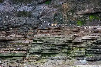 A clay shale,[9] described as bluish or bluish-gray[9] and as olive-black to brownish-black,[13] forms the lower part. The lower part can be anywhere from a few inches to several feet in thickness. This layer is sometimes referred to as the Olmstead shale. This layer has been dated to between 362.6 and 361.0 million years old based on conodont biozones (Bispathodus aculeatus aculeatus to Bispathodus ultimus ultimus zones).[14][15] Thin beds of gray or brown siltstone, lumps of pyrite, and layers of silica-heavy limestone with cone-in-cone structures are found in the lower part. In eastern Ohio, thin gray veins ("stringers") of siltstone appear.[9] In western Ohio,[8] the Cleveland Shale appears to interbed with the Chagrin Shale below it, erasing the clear boundary between the two rock units.[9]