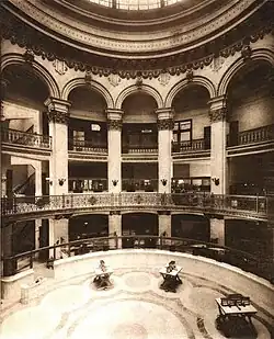 The rotunda stands above a five-sided room. Each of the walls in the room are of a different size.[59] The interior walls of the rotunda were finished in white marble and bronze capitals, light fixtures, railings, and other elements.[32][40][d] The floor of the rotunda was open space, with oak-panelled[32] offices and teller windows against the walls.[61] The interior also featured columns clad in white marble, and the drum supporting the dome was decorated with carved marble garlands, dyed in pastel colors and gilded with bronze.[13] An elaborate molded plaster frieze depicting bags of money, attorney's seals, and keys also ran around the inside of the drum.[3]