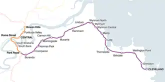 The Cleveland railway line is a suburban railway line extending 37.3 kilometres (23.2 mi) east-southeast from Brisbane, the state capital of Queensland, Australia. It is part of the Queensland Rail Citytrain network.