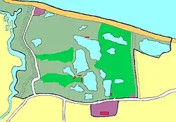 Until the mid-1600s, much of the area now known as Cley Marshes was part of a vast tidal marsh and was covered by seawater twice a day. The shoreline itself was hundreds of metres north of its present location.[4] The raised area in the north-west corner, called the "Eye", has been farmed since the earliest human habitation. It was 28 ha (70 acres) in extent in 1651, but is now much reduced by coastal erosion.[5][6] Access to the Eye was by an ancient causeway, passable at low tide.[6] John Heydon started the process of embanking the marshes to reclaim the land in 1522, and his banks were extended and improved by Dutchman Jan van Hasedunch from 1630. Simon Britiff, Lord of the local Manor of Cley, completed the scheme by building the bank on the east side of the Cley channel. Only the east and west banks have survived; the north bank was breached by the sea in 1897,[7] then rebuilt with a concrete facing, but abandoned after another bad storm in 1921.[6]