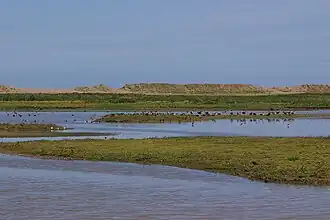 The reserve shelters behind a ridge of shingle that runs west from Weybourne along the Norfolk coast, before becoming a spit extending into the sea at Blakeney Point. Saltmarshes can develop behind the shingle, but the sea attacks the ridge and spit through tidal and storm action. The amount of shingle moved by a single storm can be "spectacular";[51] the spit has sometimes been breached, becoming an island for a time, and this may happen again.[4][52] The northernmost part of nearby Blakeney was lost to the sea in the early Middle Ages, probably due to a storm.[53]