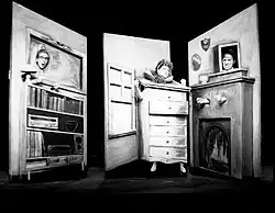 As a feminist performance group, The Clichettes' contested gender stereotypes through the use of pop culture cliches and brash humour.[11] Their brand of camp media parody exemplified the blurring between high art and entertainment occurring in the 1970s. This style of non-detached and ironic pop-culture appropriation enabled them to be critical without alienating their audience. By 1981, the trio's lip-sync performances had begun to expand to include increasing theatricality, and influences were drawn from more subversive sources. Marni Jackson became a collaborator for the production Half-Human Half-Heartache, a move for the group to expand beyond dance and into satirical theatre. The 1981 production featured a narrative casting The Clichettes as aliens who could kill by speaking, thus establishing a narrative purpose for lip-sync. The trio of aliens begins to live the facade of 1960's good-girls but eventually become entangled in the problematic dynamics of this life. The cabaret show was a hit in Toronto, with productions that followed in Ottawa and Vancouver. Their next stage endeavour was more ambitious: She-Devils of Niagara (1985) depicted a dystopian future where gender was strictly regulated, and history had been banished to the basement of a wax museum in Niagara Falls.[12] As the Clichettes' acclaim increased throughout the 1980s, their performances started to poke fun at more than just mass-market depictions of girls. Their 1985 production Go To Hell saw the group adopt anatomically correct male bodysuits as a means to expand their critique to the stereotypes of masculinity. Armed with fake guitars, they parodied the macho posturing of cock rock bands. By spoofing the gestures of those musicians and lip-syncing their lyrics, the Clichettes were denouncing the contrived affectations of male stars.[1] The height of their lip-sync career came in 1984, when they travelled to Houston, Texas, to compete and won the grand prize in the National Lip-Sync Contest.[1] The Clichettes disbanded in 1993.[13]