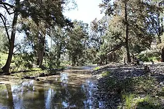 A thermal spring is located on the Belubula River near the caves. It is only one of three thermal springs associated with karst in NSW.[17] It was first recorded by Wilkinson in 1892,[18] and an analysis of the water appears in a report by Oliver Trickett in 1908.[19] Warm springs rising from Palaeozoic rock (as opposed to those from the Australian Basin) are rare in NSW, with only three documented, all in karst areas. These are the Cliefden Warm Spring, a warm spring at Wee Jasper and the warm spring at Yarrangobilly Caves. There has been little study of warm springs in NSW.Despite assertions to the contrary, the Cliefden Thermal Spring is not on private property and is accessed via a public road.