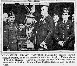 After moving to Paris in the early 1920s, Harmon became an advocate for various aviation causes. In December 1924 he offered to replace the Gordon Bennett Cup after it had been won by Belgium;[25] the following year he proposed a memorial in Paris to Lafayette Escadrille aviators; the model for the monument became the Harmon Trophy for aviation.[26] In 1926 Harmon founded and financed the International League of Aviators (Ligue Internationale des Aviateurs),[27] followed by a promotional tour of Europe financed by the King of Belgium and using a Caproni bomber on loan from the Italian Air Force.[28]