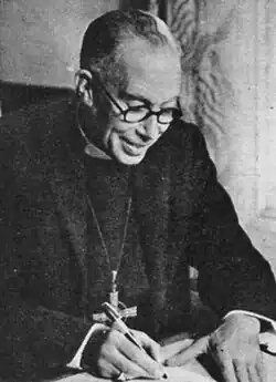 Martin's gifts as a pastor was the main reason why he was chosen to succeed Albert David as Bishop of Liverpool when David retired in 1944.[5] More senior clergy including an overseas bishop and four serving diocesan bishops in sees in England were considered for the post but Martin, who was an Evangelical and had gained fame when his parish church in Plymouth was destroyed and he had turned the site into a garden, was selected. Martin was not, as was customary for a bishop, an academic; his appeal rested on the strength of his pastoral work.[6] His appointment was a surprise. He was consecrated a bishop on St James's Day 1944 (25 July), by Cyril Garbett, Archbishop of York, at York Minster.[7] Kennerley writes that David, a scholar and former schoolmaster, was more respected than loved in the diocese.[8] With Martin's arrival there came "a great improvement in the relationship between Cathedral and diocese."[1]
