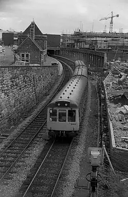 When the railways were nationalised in 1948, services at Clifton Down came under the aegis of the Western Region of British Railways,[2] and there remained a strong staff presence in 1958, with a station master, chief booking clerk, four other clerks, six porters, a shunter, a checker and a weighbridge assistant.[1] Passenger numbers however dropped sharply in 1961 as the result of a fare increase, and so in 1962 a new reduced timetable was enacted, which lost more passengers, and saw the withdrawal of a special schoolchildren's service.[3] A year later in 1963, the Beeching report suggested that all services along the Severn Beach Line be withdrawn. Following meetings with staff, it was decided to keep the line open to Severn Beach, but to close the section to Pilning, and also end services via Henbury.[2] These services duly ended,[4] and in July 1965 the goods yard at Clifton Down also closed.[1] The line however was still threatened, and on 10 February 1967 it was announced that all services between Stapleton Road and Severn Beach would be discontinued. An enquiry followed, and in June that year the decision was reversed, on the condition that tickets be issued on the trains. Thus, on 17 July 1967, all stations along the line, including Clifton Down, had their staff withdrawn.[1][2] The decrease of costs allowed a reduction of ticket prices, but the line was still under threat until in June 1969 it was decided that the line's closure would result in significant hardship, and so a grant was allocated to ensure continued services.[2] Service levels however still declined: though the "Monkey Specials" were still going strong into the 1960s, with 340,000 excursion passengers arriving between 1958 and 1966, the closure of many of the Welsh Valley Lines and the construction of the Severn Bridge led to their demise in the early 1970s. Most of the Severn Beach Line was reduced to single track in late 1970, leaving Clifton Down as one of the few passing places. The glass platform canopies were completely removed in May 1971, and the glass-covered footbridge was also removed, leaving a set of steps from Whiteladies road as the only access to the southern platform.[1] In the late 1970s and the early 1980s, the Clifton Down Shopping Centre was built over most of the goods yard,[5] the rest covered by a housing development.[6][1]