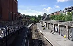Clifton Down railway station is on the Severn Beach Line, serving the district of Clifton in Bristol. The station is located on the busy shopping street Whiteladies Road, next door to a shopping centre. The wider area is largely residential. Bristol Zoo is under a mile away.[6] The station is located 3 miles 72 chains (6.3 km) along the line from Bristol Temple Meads, and 9 miles 51 chains (15.5 km) from Severn Beach.[27][28][note 1] It is the fifth station from Temple Meads.[29] There are two running lines, roughly orientated east–west, but curving towards the north at both ends. There are two 120-yard (110 m)-long platforms to the north and south of the running lines, connected by a footbridge at the east end.[6] The southern platform, Platform 1, serves trains towards Avonmouth, the northern platform, Platform 2, serves trains towards Temple Meads.[30] The station is in an enclosed cutting, and runs under the road to the east.[6] To the west is the Clifton Down Tunnel under Clifton Down,[6] from which the station takes its name. The station is one of the few double track sections of the Severn Beach Line, and so is often used as a passing place.[31]