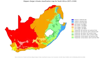 Climate change in South Africa is leading to increased temperatures and rainfall variability. Evidence shows that extreme weather events are becoming more prominent due to climate change.[1] This is a critical concern for South Africans as climate change will affect the overall status and wellbeing of the country, for example with regards to water resources. Just like many other parts of the world, climate research showed that the real challenge in South Africa was more related to environmental issues rather than developmental ones.[2] The most severe effect will be targeting the water supply, which has huge effects on the agriculture sector.[3] Speedy environmental changes are resulting in clear effects on the community and environmental level in different ways and aspects, starting with air quality, to temperature and weather patterns, reaching out to food security and disease burden.[4]