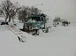 While normal annual snowfall exceeds 38 inches (0.97 m) in Chicago, the southern portion of the state normally receives less than 14 inches (0.36 m).[1] The snowiest winter on record for Chicago was 89.7 inches (2.28 m) during the winter of 1978–79.[19] The city has also recorded two other winters with snowfall in excess of 80 inches (2.03 m)—1977-78 and 2013-14. During the winter of 1830–31, southern sections of the state were covered with 3 feet (0.91 m) of snow, with drifts up to 6 feet (1.8 m) tall. Storms exceeding the normal winter value are possible within one day mainly in the southern half of the state. The heaviest snowfall recorded in Chicago history was 23 inches (0.58 m) during the Blizzard of 1967.[20]