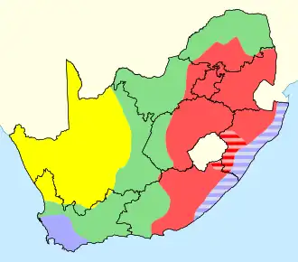 Climatic zones are often referred to by the seasonal pattern of rainfall. The winter rainfall region is confined to a relatively small area in the south-west, the Western Cape area, where gentle rain falls from May to August but the summers are dry. The summer rainfall region is the largest, being most of the country north of the coastal areas and the north west arid desert. Rain falls from October to February and is often heavy, with the amount of precipitation increasing from west to east. The summer and winter rainfall region is the Eastern Cape. The arid regions are in the north-west, with the driest areas being the north-west coast. Vegetation tends to vary by climatic zone[6] and these also correspond to the horticultural zones.[7]