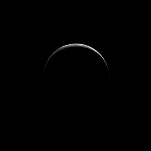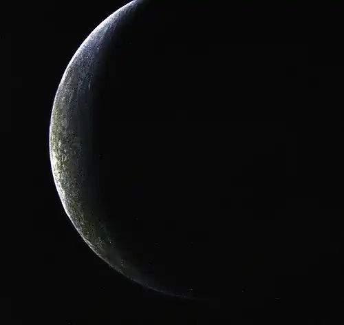 Images of Triton's limb and terminator by Voyager 2 discovered multiple thin, bright clouds. The thin clouds on Triton are likely composed of condensed nitrogen crystals suspended in Triton's atmosphere. The clouds have an optical depth of roughly 0.063 in the violet range (0.41 μm), with some clouds being significant enough to obscure parts of Triton's surface. Distinct, east-to-west crescent-shaped clouds roughly 10 km wide and hundreds of kilometers long were observed beyond Triton's terminator, with the clouds estimated to be 1–3 kilometers above the surface. Up to one-third of Triton's limb near its southern regions were covered by clouds.[11][1]: 873 [12]