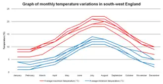 - ^ a b c d e "South-west England: Temperature". The Met Office. Archived from the original on 24 February 2007. Retrieved 16 April 2009.