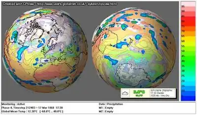 The real-time desktop visualisation for the model launched in 2003 was developed[26] by Jeremy Walton at NAG, enabling users to track the progress of their simulation as the cloud cover and temperature changes over the surface of the globe. Other, more advanced visualisation programs in use include CPView and IDL Advanced Visualisation. They have similar functionality. CPView was written by Martin Sykes, a participant in the experiment. The IDL Advanced Visualisation was written by Andy Heaps of the University of Reading (UK), and modified to work with the BOINC version by Tesella Support Services plc.