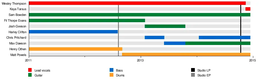Evans departed in early 2013 to join Neck Deep full-time and Clifton and Othen both departed in 2012.[2] The firing of Thompson in 2014 lead to the bands eventual break up (from which Bowden, Powels, Pritchard and Dawson recruited Kaya Tarsus forming Blood Youth).[3]