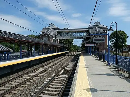 In October 2017, the state announced that construction would begin in March 2018 and be completed by December 2019.[21] It was announced in January 2018 that the then-$18 million project would be postponed again until new funding was identified.[22][23] However, bidding for the project took place in August 2018.[24][25] Funding was nearly withdrawn in December 2018, but town officials convinced the state to allow the project to proceed.[23] A groundbreaking for the $12.5 million project was held in June 2019, with completion then expected in January 2021.[23][26] The second platform and footbridge opened on April 4, 2022, doubling the amount of service that stops at the station.[27]