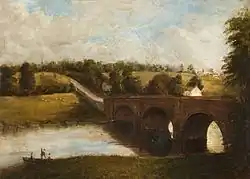 Boating at Brungerley by Benjamin Satterthwaite (1848–1923). Oil on canvas, 50 x 60 cm (approx). Gift from Captain R.C. Musson.[7] Satterthwaite depicts three people in a boat at the bank of the River Ribble close to Brungerley Bridge. The three-span stone bridge is believed to have been built around 1814 after the previous stone bridge had been destroyed by floods. It is located between Waddington and Clitheroe.[8] This painting is one of three works by Satterthwaite in the museum's collection, the other two feature Downham and Whalley Abbey.[7]
