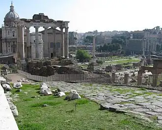 The main road to the Roman Capitol, the Clivus Capitolinus ("Capitoline Rise") starts at the head of the Roman Forum beside the Arch of Tiberius as a continuation of the Via Sacra; proceeding around the Temple of Saturn and turning to the south in front of the Portico Dii Consentes, it then climbs up the slope of the Capitoline Hill to the Temple of Jupiter Optimus Maximus at its summit.[1] This was traditionally the last and culminating portion of all Roman triumphs.[2][3]