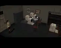 Clock Tower is a point-and-click adventure game with 3D graphics.[1][2] The player may use a PlayStation controller or mouse to move the cursor on the screen.[3][4] The cursor changes shape when placed over certain objects, which the player can click to interact with. Clicking on any location guides the player character in that direction. Moving the cursor to the top of the screen reveals the player's inventory. Clicking on an item and then clicking on an object on the screen uses the item on that object or in that location. Some items such as keys are used automatically when clicked.[5]