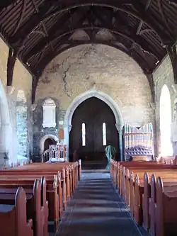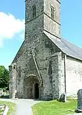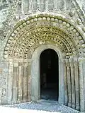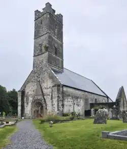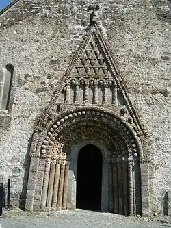 The earliest part of the church dates back to around 1180.[3] Its doorway is the crowning achievement of Hiberno-Romanesque style. It is in six orders, and has a large variety of motifs, animal heads, foliage, human heads etc. Above the doorway is a pointed hood enclosing triangles alternating with bizarre human heads, and below this is an arcade enclosing more human heads. The early 13th century east windows in the chancel is an example of a late Romanesque windows. The chancel arch was inserted in the 15th century, and is decorated with angels, a rosette and a mermaid carrying a mirror. The mermaid is worn smooth from human hands.[4] The supporting arches of the tower at the west end of the church are also decorated with 15th century heads, and the innermost order of the Romanesque doorway was also inserted at this time.[5] The sacristy is also 15th century. The church had a Romanesque south transept, which is now in ruins, and a Gothic north transept, which has been removed. In the Roman Catholic church one mile to the south is a 14th-century wooden statue of the Madonna and Child, and on the roadside near this church is a 16th-century tower-house.