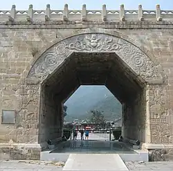 By the early Ming Dynasty (1368–1644) two of the three dagobas on the platform had collapsed or had been dismantled.[7] By the reign of the Zhengtong Emperor (1427–1464) no dagobas remained, and the structure was given the name "Cloud Platform", because from a distance it seemed to rise out of the clouds.[4] A project to restore the platform was carried out between 1443 and 1450. When the platform was surveyed by a Japanese expedition in 1943 a stele commemorating the restoration, dated 1448, was found on top of the platform.[8] However, the restoration was not completed until 1450, as evidenced by an inscription on the far right-hand side of the inner west wall of the platform, dated the 15th day of the 5th month of the 15th year of the Zhengtong era (1450), that records that the restoration was carried out by a benefactor named as Lin Puxian (林普賢).[9] The restoration involved building a five-roomed wooden Buddhist hall, called the Tai'an Temple (泰安寺), on top of the platform, in place of the original dagobas.[2][10]