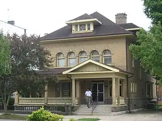 Following Clutts' death in 1927,[2] his home became known as the "Reese Building."[1] Since that time, it has ceased to be used for residential purposes; the present occupants are the law firm of Oths, Heiser, and Miller,[5] which has converted it into their law offices.[6] Little has changed inside or outside the house in the century since its construction: although it has ceased to be used as a residence, the home still features most of its original decorative details and structural elements.[2] In 1980, the Clutts House was listed on the National Register of Historic Places,[1] qualifying both because of its connection to Clutts himself and because of its well preserved and historically significant architecture.[4] It is one of three buildings on the Register in the city of Wellston, along with the Morgan Mansion and the Harvey Wells House.[1]