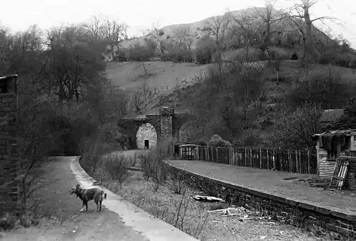 The station had two platforms; on the Up platform was a station building of generous proportions constructed of locally sourced limestone.[13] A private siding served the Clydach and Abergavenny Lime and Stone Company which operated a nearby limestone quarry and lime kilns supplying the Clydach Ironworks.[14][15][16] The company used its own private owner wagons.[10] The siding trailed off upwards to the north-east at the western end of the viaduct where a weighing machine and office were installed in the fork of the junction.[15] Opposite the weighing machine was a signal box built in 1898.[17] The works closed in c. 1935 after which goods facilities were withdrawn from Clydach on 2 May 1938.[18][16]
