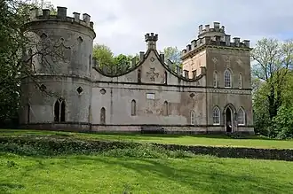 Clytha Castle is a crenellated stone folly with gothic windows set on a rounded hill, amid chestnut groves, overlooking Clytha Park and the River Usk.[4] It was built in 1790 by William Jones of Clytha Park in memory of his wife, Elizabeth Morgan.[5] William Jones engaged John Davenport, an architect based in Shrewsbury to design the castle, built "for the purpose of relieving a mind sincerely afflicted by the loss of a most excellent wife".[5] A tablet set into the walls of the folly records this dedication.[b][8] The castle was for many years believed to have been designed by John Nash, but recent research has confirmed Davenport's authorship.[4]