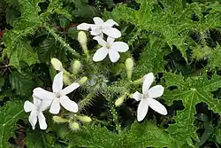 Cnidoscolus texanus, commonly known as Texas bullnettle[2] (also Texas bull nettle[3] and Texas bull-nettle[4]), tread-softly, mala mujer, and finger rot, is a perennial herb covered with stinging hairs. The main stem, branches, leaves, and seed pods are all covered with hispid or glass-like bristly hairs that release an allergenic toxin upon contact. Contact with the plant results in intense pain: stinging, burning, and itching lasting for hours. It is native to the U.S. states of Texas, Arkansas, Kansas, Louisiana, and Oklahoma[5] and also native to the northeastern state of Tamaulipas, Mexico.[6] It is a herbaceous flowering plant that grows between 30–80 cm (11.8–31.5 in) tall and as much as 1 m (3.3 ft) across.[7] Texas bullnettle (Cnidoscolus texanus) has showy, fragrant white flowers that can bloom throughout the year in southern regions of its distribution, predominantly March to November in northern regions.[3][8] It is a drought-tolerant plant, therefore making it a superb choice for xeriscaping. This plant is attractive to birds, bees, butterflies, and other insects. The seeds are known to be consumed by Rio Grande wild turkeys (Meleagris gallopavo intermedia) and mourning doves (Zenaida macroura).[9]