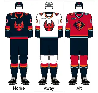 The Firebirds announced their inaugural season uniforms on January 24, 2022, at the Palm Springs Air Museum. They were delivered by the Seattle Kraken, the jerseys themselves in treasure chests. The Firebirds have two main uniforms, one a dark blue color and the other white. Both uniforms feature the Firebirds logo in the center, as well as red, orange, and light-blue stripes around the sleeves, with red and light-blue stripes in the bottom.[41] The blue eye color of the Firebird logo is a tie-in to the blue used by the Kraken.[11] The Kraken logo adorns one shoulder.[11]
