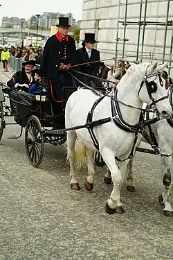 The English word coach, the Spanish and Portuguese coche, the German Kutsche, the Slovak koč and the Czech kočár all probably derive from the Hungarian word "kocsi", literally meaning "of Kocs".[1] Kocs (pronounced "kotch") was a Hungarian post town, and the coach itself may have been developed in Hungary. Hungarian villages still hold Coachman of the Year competitions (similar to those held in Zakopane in Poland).[2]