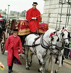 The coachman's first concern is to remain in full control of the horses (or other similar animals such as mules) and another employee, traditionally a footman, would accompany the coach to handle any circumstances beyond the coachman's control.