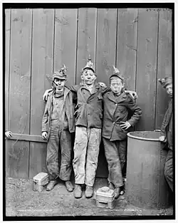Until about 1900, nearly all anthracite coal breakers were labor-intensive. The removal of impurities was done by hand, usually by boys between the ages of 8 and 12 years old known as breaker boys.[15][16][17][18] The use of breaker boys began in the U.S. around 1866.[3][19] The breaker boys would sit on wooden seats, perched over chutes and conveyor belts, picking slate and other impurities out of the coal.[15][16][17][19][20][21] Breaker boys worked 10 hours a day for six days a week.[22] The work was hazardous. Breaker boys were forced to work without gloves so that they could handle the slick coal better.[16][17][20] The slate, however, was sharp, and boys would leave work with their fingers cut and bleeding.[16][17][20] Many breaker boys lost fingers to the rapidly moving conveyor belts, while others, moving about the plant, had their feet, hands, arms, and legs amputated when they moved among the machinery and accidentally slipped under the belts or into the gears.[9][15][16][21] Many died when they fell into the gears of the machinery, their bodies only retrieved at the end of the working day.[9][15][16][21] Others were caught in the rush of coal, and crushed to death or smothered.[9][15][16][21] The "dry" coal kicked up so much dust that the breaker boys sometimes wore lamps on their heads to see, and asthma and black lung disease were common.[9][15][16][19][20]